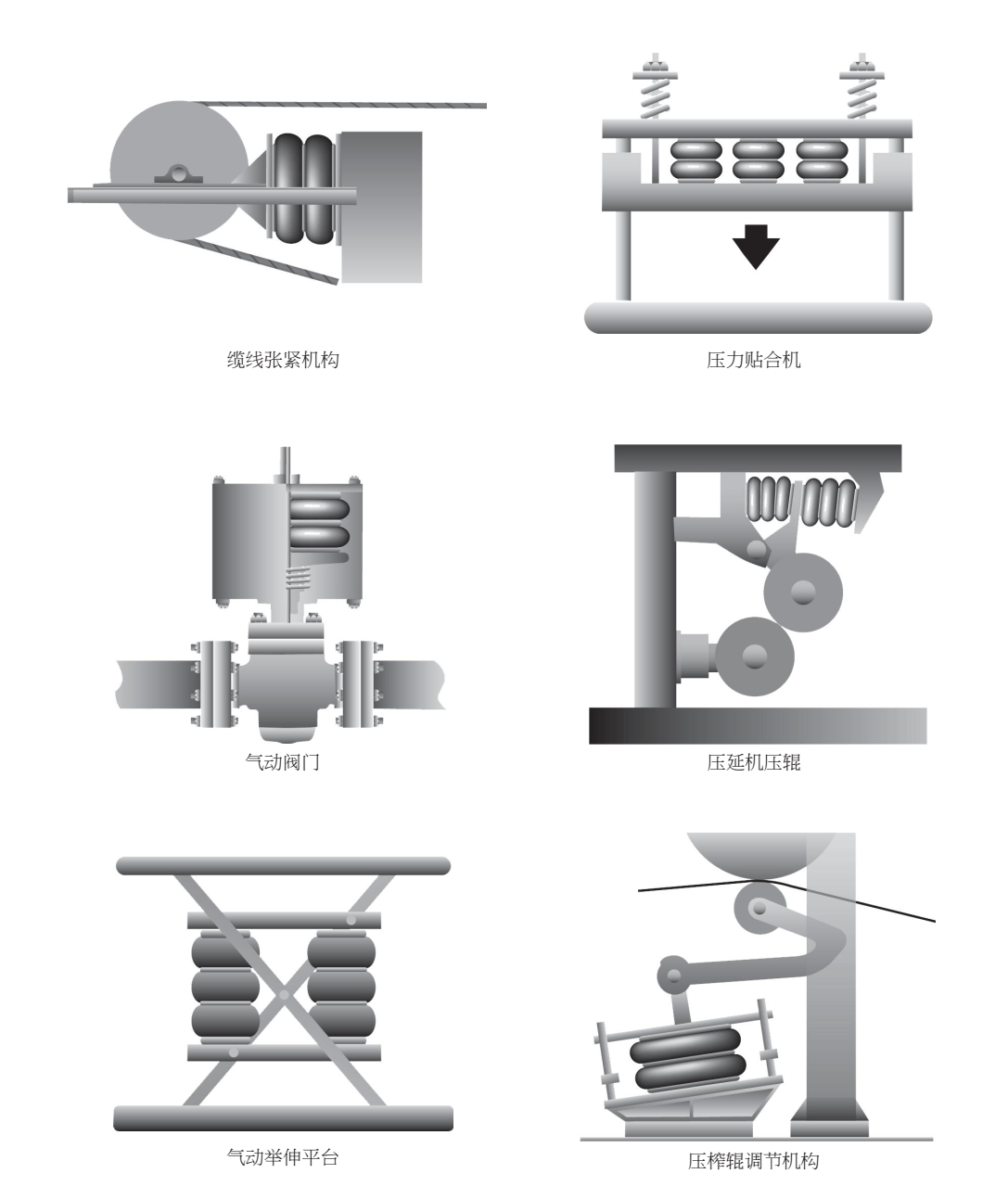 HF型活套式空氣彈簧、K型鎖扣式空氣彈簧、GF固定式空氣彈簧、ZF型自密封式空氣彈簧、JBF型卷邊式空氣彈簧、沖壓式法蘭空氣彈簧等等。